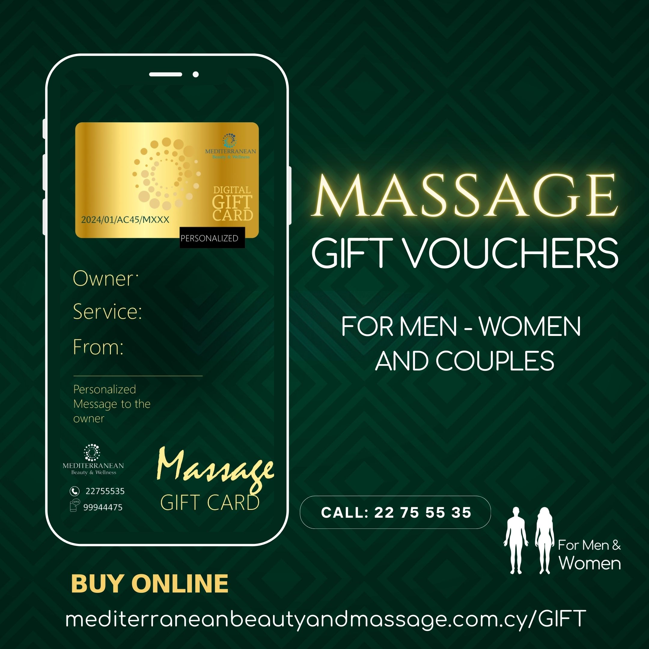 Εσείς μπορείτε να επιλέξετε είτε μια υπηρεσία από τον κατάλογο μας και να την προσφέρετε σαν δώρο , για παράδειγμα 1 Full Body Massage είτε να επιλέξετε το ποσό που θέλετε να δαπανήσετε , για παράδειγμα 50€ και να αποφασίσει το άτομο που θα το προσφέρετε πως θα το αξιοποιήσει.